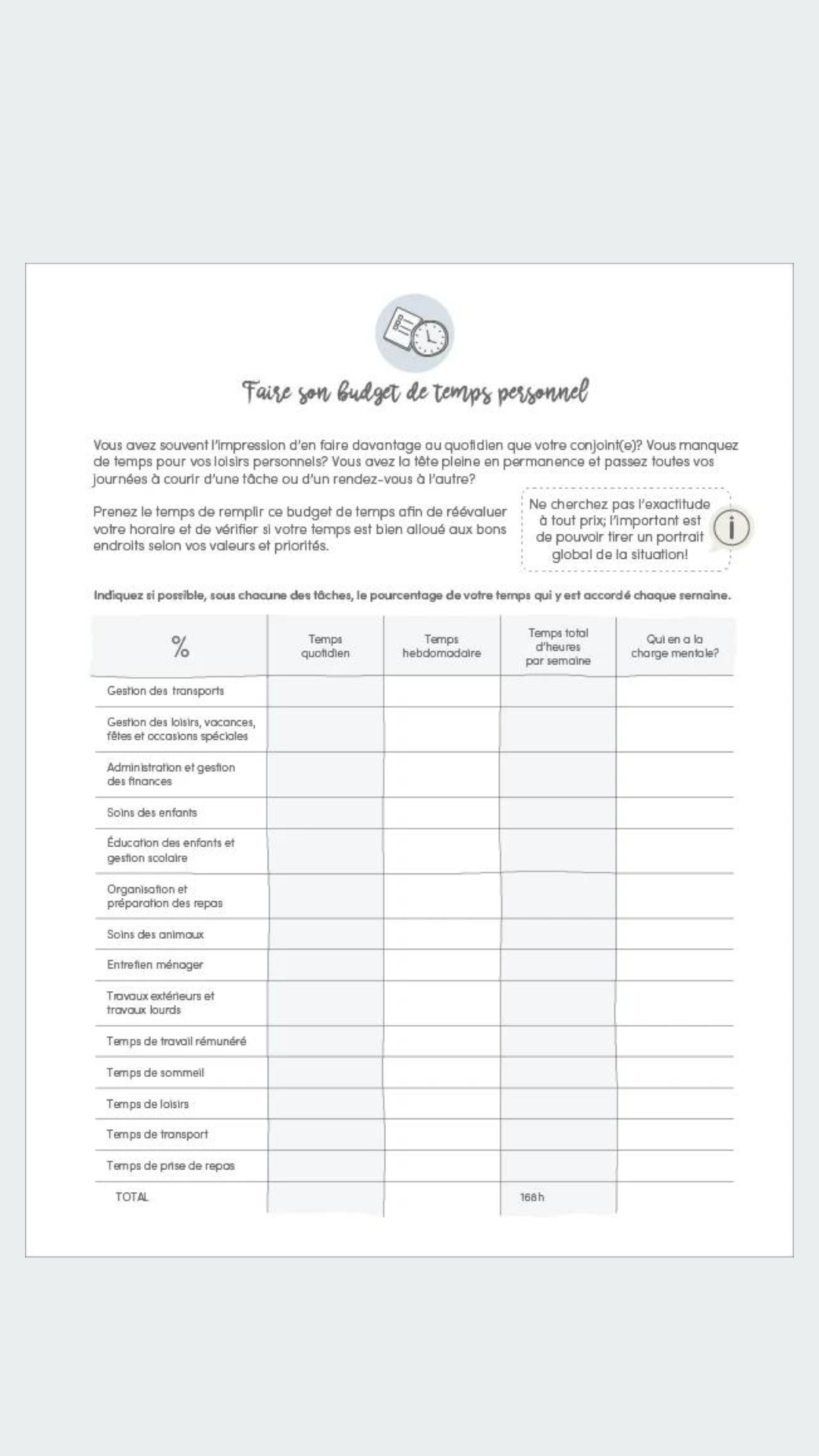 Prenez le temps de remplir ce budget de temps afin de réévaluer votre horaire et de vérifier si votre temps est bien alloué aux bons endroits selon vos valeurs et priorités.