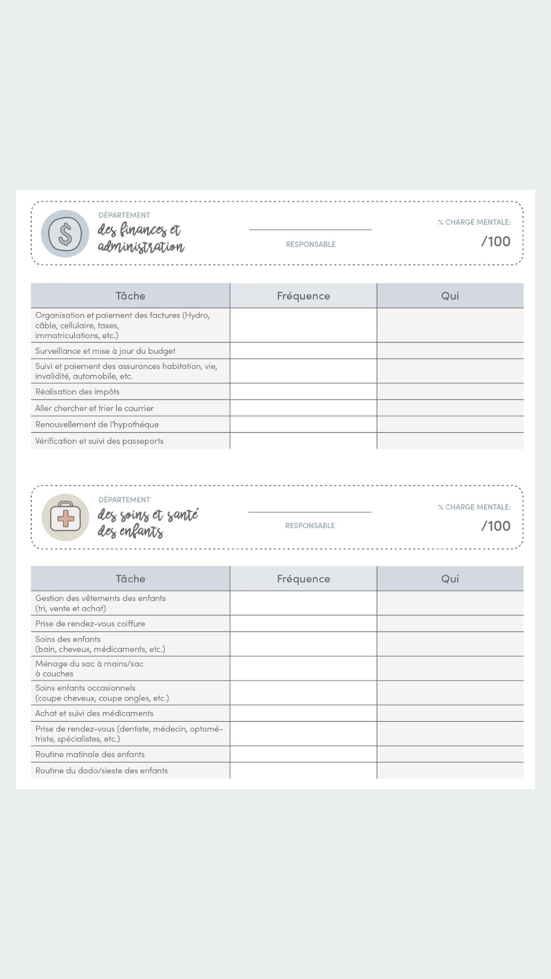 Selon votre réalité personnelle et familiale, déterminez qui sera dorénavant gestionnaire de chacun des départements suivants en tenant compte de la fréquence et du temps d’exécution de chacune des tâches qui s’y trouve. Vous pouvez aussi déterminer dès maintenant de déléguer certaines des tâches en prenant bien soin d’en évaluer le coût et l’éventuelle charge mentale supplémentaire. C’est aussi le moment d’évaluer quelles tâches pourraient dorénavant être la responsabilité des enfants. Enfin, n'oubliez pas de refaire cet exercice chaque année!