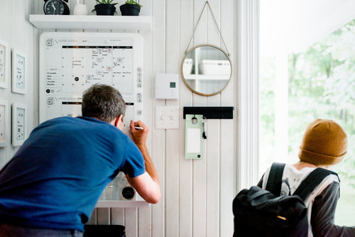 - Nos planificateurs familiaux sont disposés dans des endroits à la vue de tous. Ici, nous avons installé deux planificateurs mensuels dans le vestibule et un planificateur hebdomadaire sur le frigo.